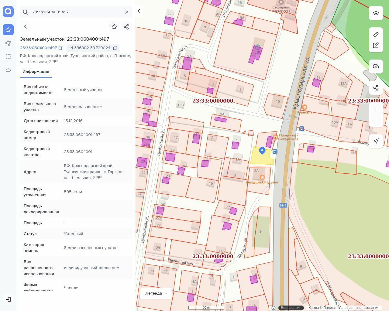 Земельный участок, кадастровый номер: 23:33:0604001:497; категория земель: земли населенных пунктов; вид разрешенного использования: индивидуальный жилой дом; площадь: 595 +/- 9 кв.м.;