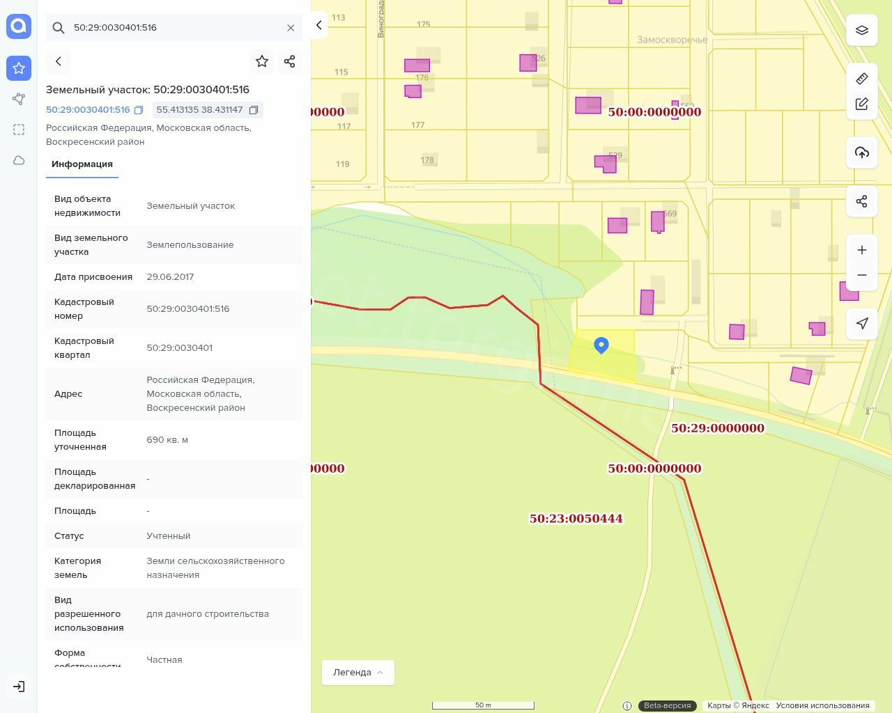 Земельный участок, площадь 690 м²; кадастровый номер: 50:29:0030401:516; категория земель: земли сельскохозяйственного назначения.
