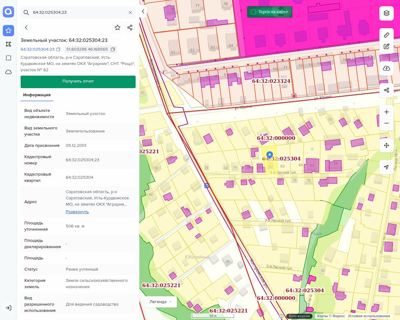 Земельный участок, кадастровый номер 64:32:025304:23, вид разрешенного использования: для садоводства, площадь: 506+/-16 кв.м.