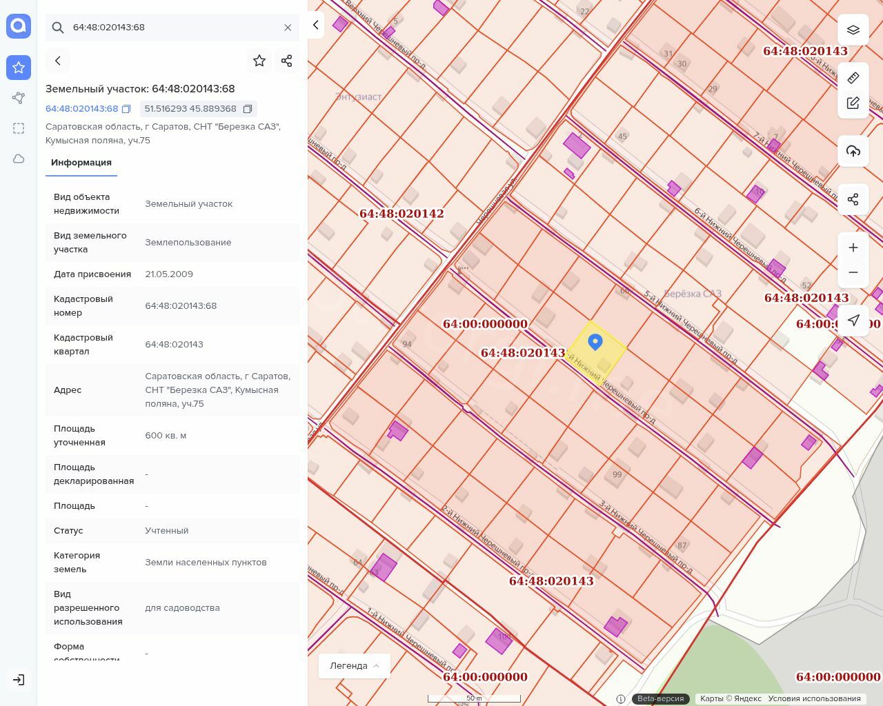 Кадастровый номер: 64:48:020124:156 64:48:020124:96 64:48:020143:68