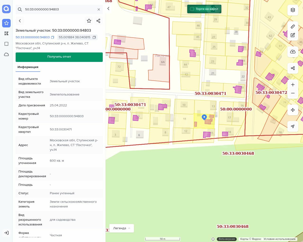 Земельный участок, земли сельхозназначения, для садоводства, пл. 600+/-17 кв. м, КН: 50:33:0000000:94803