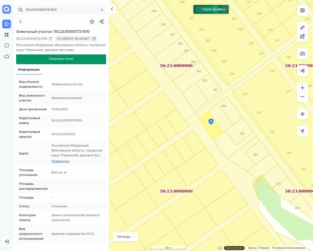 Лот №1: Земельный участок, общей площадью 600 кв.м., кад. № 50:23:0050573:1510, категория/ВРИ – ЗСН/СНТ