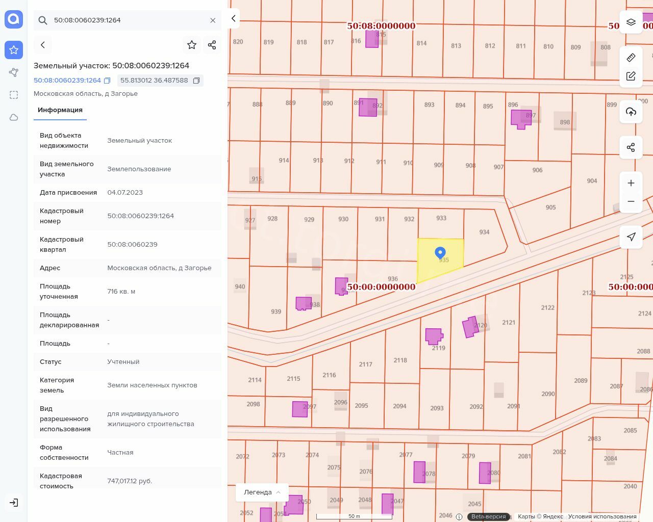 Лот № 1. Земельный участок, кадастровый номер 50:08:0060239:1264, площадь 716 +/- 9 кв.м., вид права: Собственность.