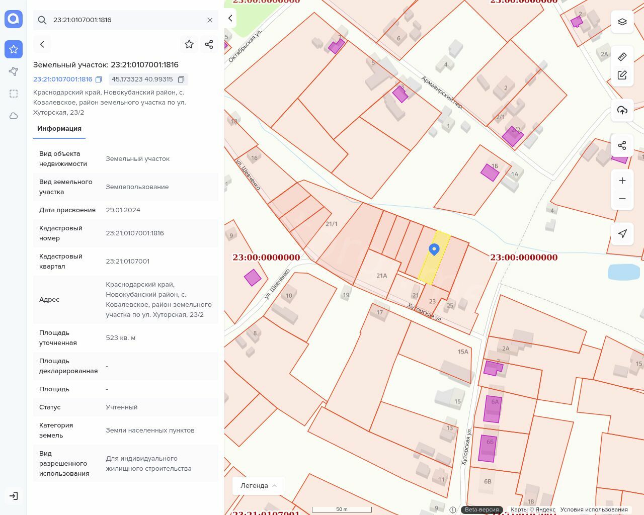 Земельный участок, кадастровый номер 23:21:0107001:1816, площадь кв. м: 523, уточненная площадь, погрешность 8.0, категория земель: земли населенных пунктов.