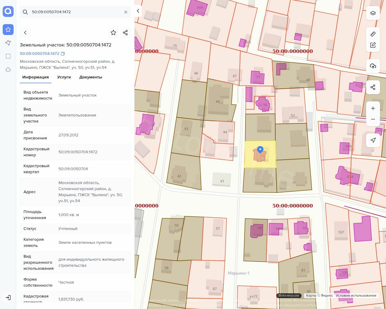 Земельный участок: площадь 1000 +/-11 кв. м., категория земель: земли населенных пунктов, разрешенного использования: для индивидуального жилищного строительства. Кадастровый (условный) номер: 50:09:0050704:1472.