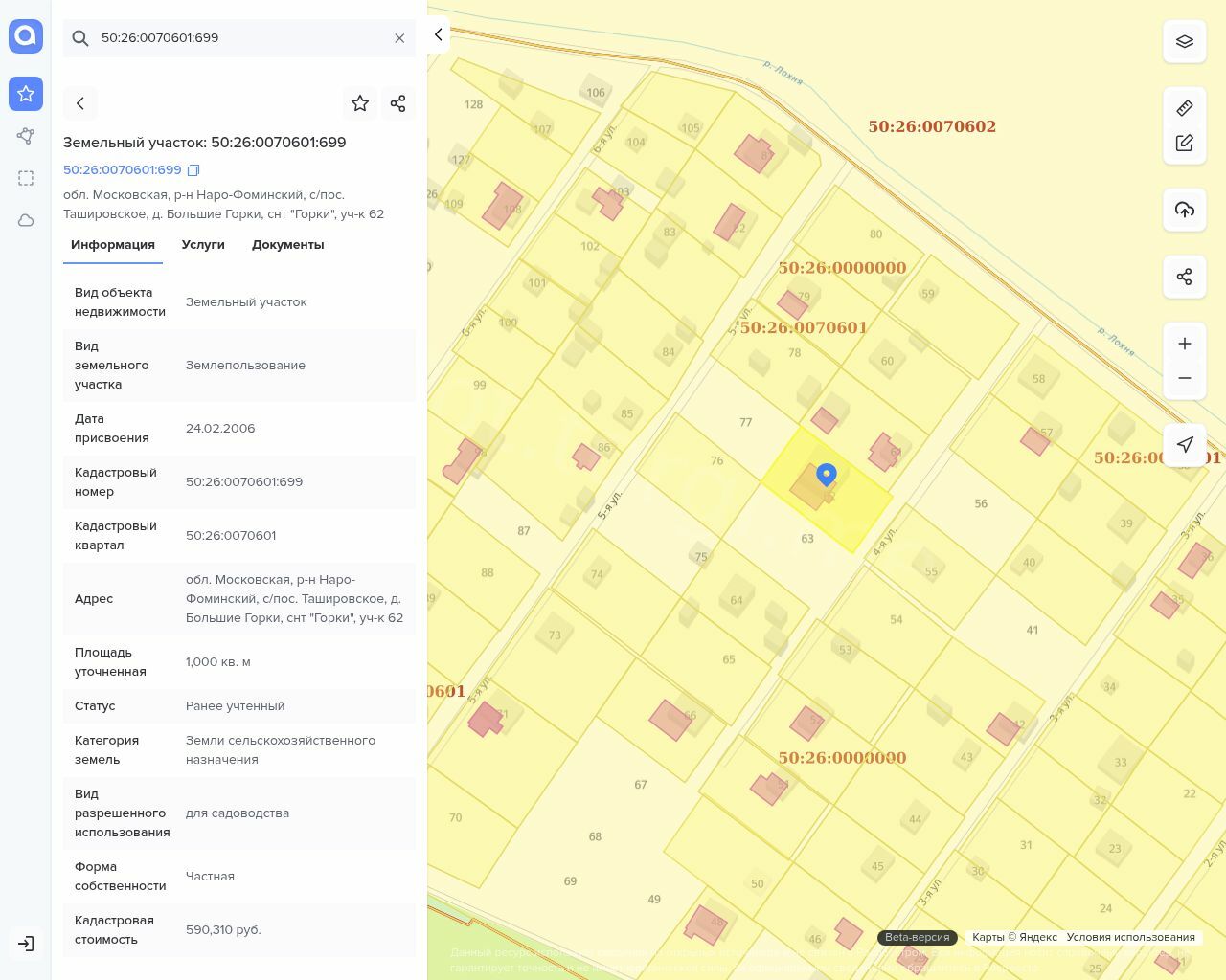 Земельный участок, площадью 1000 +/- 22 кв. м, категория земель: Земли сельскохозяйственного назначения, разрешенное использование: Для садоводства, с кадастровым номером: 50:26:0070601:699