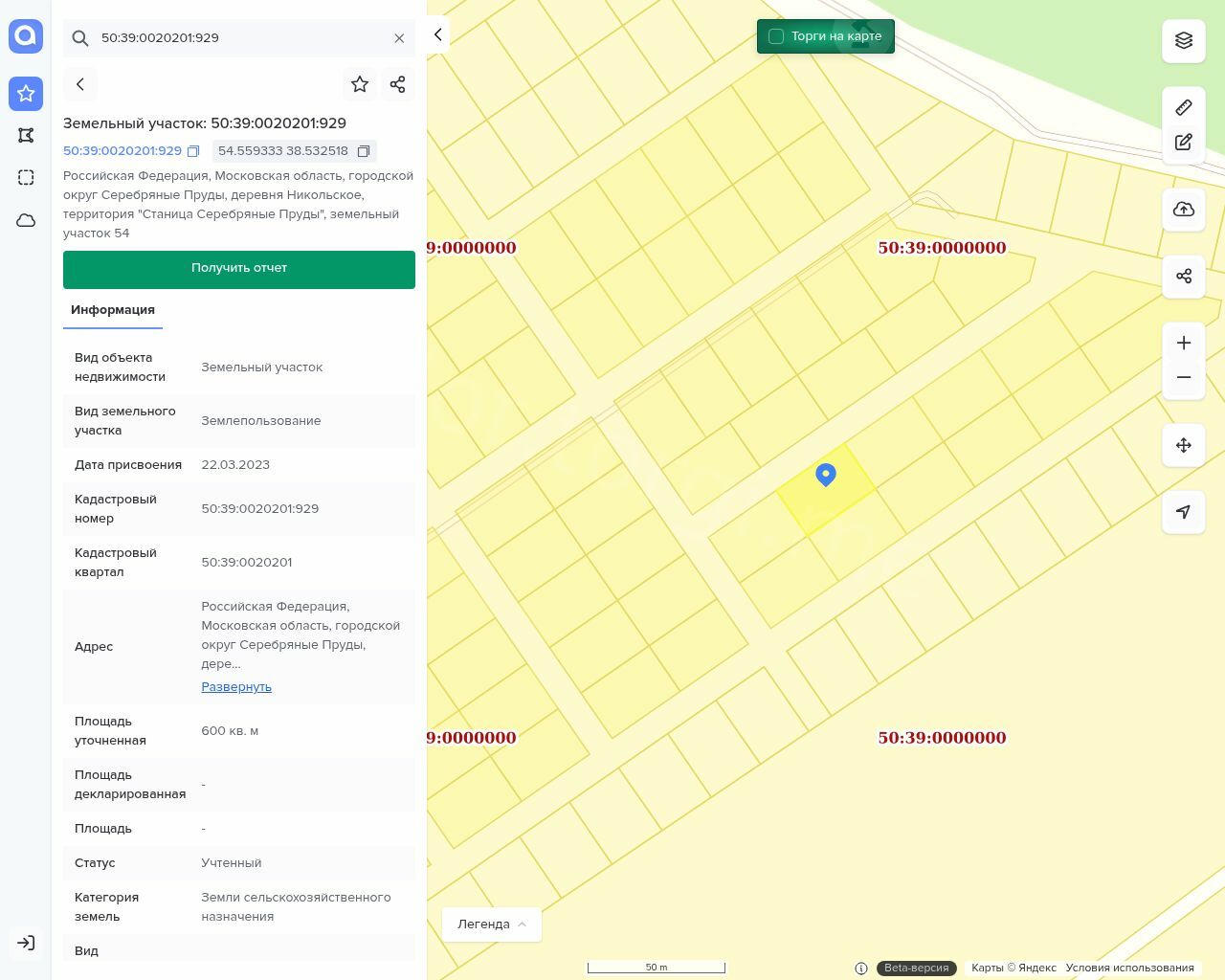 Земельный участок с кадастровым номером 50:39:0020201:929, пл. 600,00 кв.м.