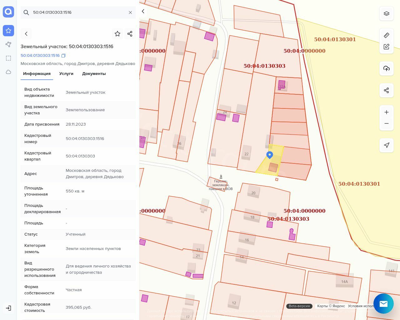 Земельный участок - площадь: 550 кв.м.; кадастровый номер: 50:04:0130303:1516; категория земель: Земли населенных пунктов; виды разрешенного использования: для ведения личного хозяйства и огородничества;