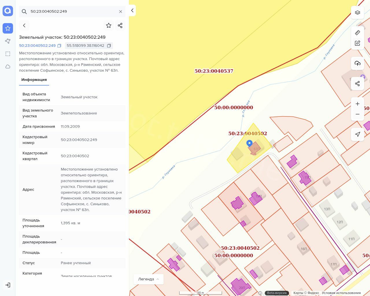 Адрес: Местоположение установлено относительно ориентира, расположенного в границах участка. Почтовый адрес ориентира: обл. Московская, р-н Раменский, сельское поселение Софьинское, с. Синьково, участок № 63п