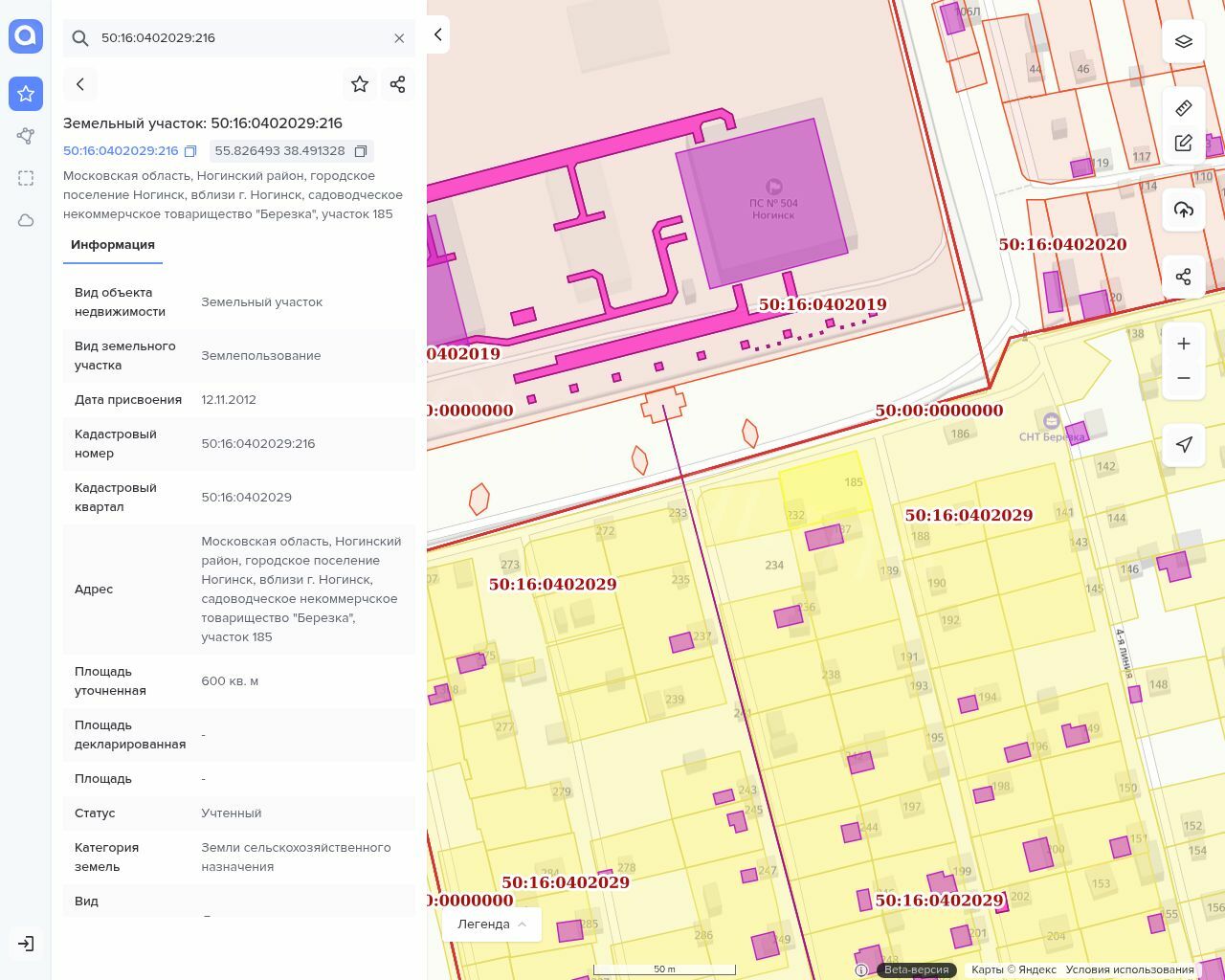 Лот №1 Земельный участок, Кадастровый номер: 50:16:0402029:216, собственность, Площадь: 600 кв.м.