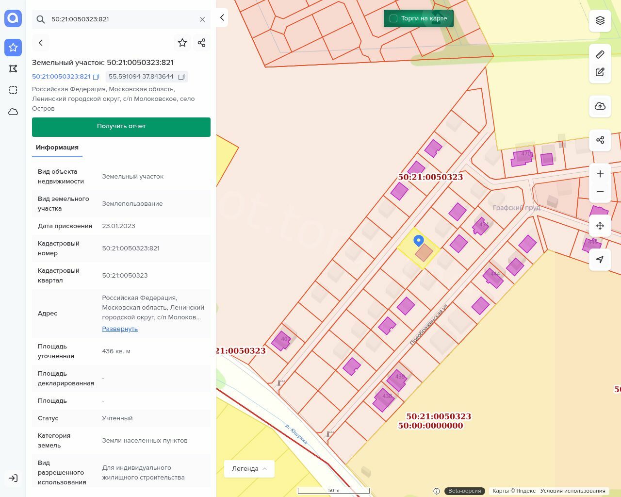 Земельный участок, кадастровый номер 50:21:0050323:821, площадью 436 +/- 7
