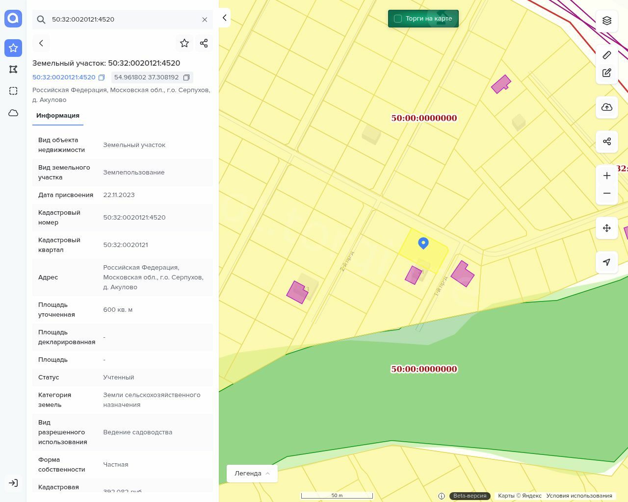 Земельный участок, кадастровый номер 50:32:0020121:4520, площадью 600 кв.м.
