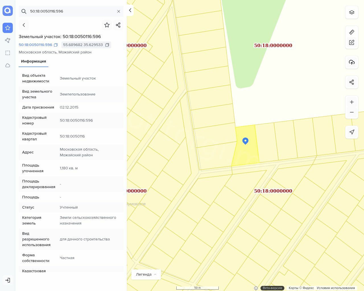 Земельный участок, общей площадью 1 180 м2, с кадастровым номером 50:18:0050116:596