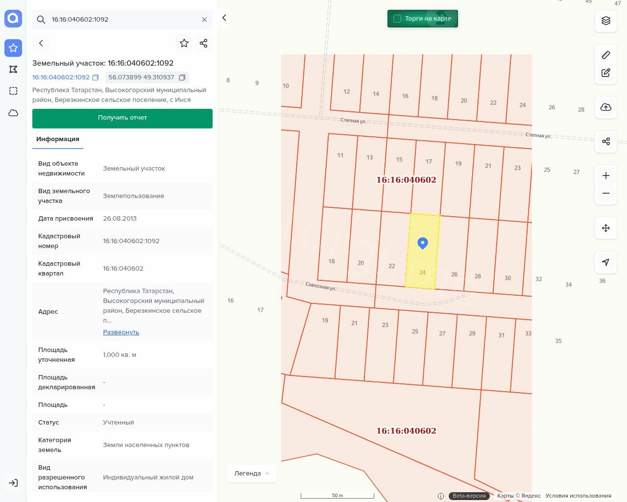 Земельный участок с кадастровым номером 16:16:040602:1092, площадью 1 000 м2